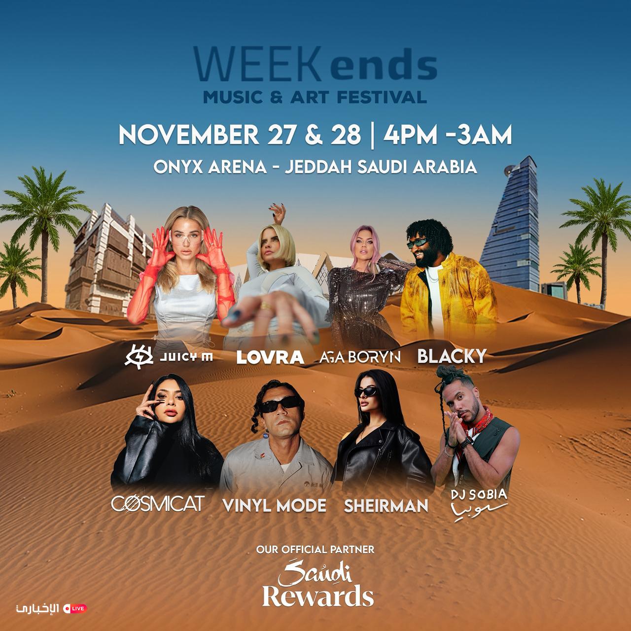 تنطلق يوم الخميس المقبل وبدعم من “روح السعودية ” فعاليات مهرجان “ويكندز” للموسيقى والفنون في جدة، بمشاركة 22 فنانًا ونجمًا عالميًا ومحليًا، على مدار يومين متتاليين، 27-28 نوفمبر، في “أونيكس أرينا”