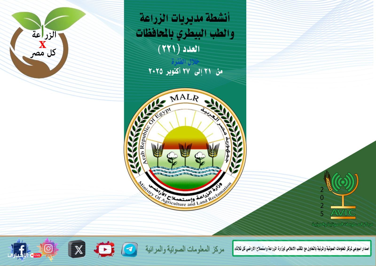 أصدر مركز المعلومات الصوتية والمرئية التابع لوزارة الزراعة واستصلاح الأراضي، والمكتب الاعلامي للوزارة، العدد رقم 221 من اصدار: “الزراعة في كل مصر” بالانفوجراف والفيديو، يوضح الجهود والانشطة التي تقوم بها مديريات الزراعة والطب البيطري بمحافظات الجمهورية خلال الفترة من 21 إلى 27 اكتوبر الجاري