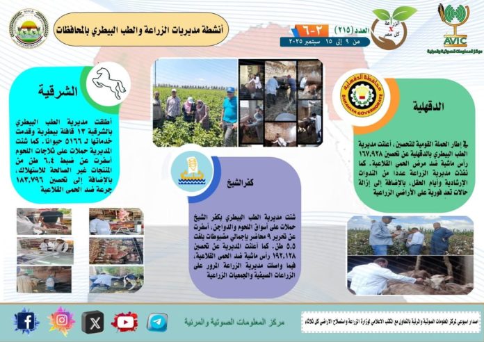 أصدر مركز المعلومات الصوتية والمرئية التابع لوزارة الزراعة واستصلاح الأراضي، والمكتب الاعلامي للوزارة، العدد رقم 215 من اصدار: “الزراعة في كل مصر” بالانفوجراف والفيديو، يوضح الجهود والانشطة التي تقوم بها مديريات الزراعة والطب البيطري بمحافظات الجمهورية خلال الفترة من 9 وحتى 15 سبتمبر الجاري.