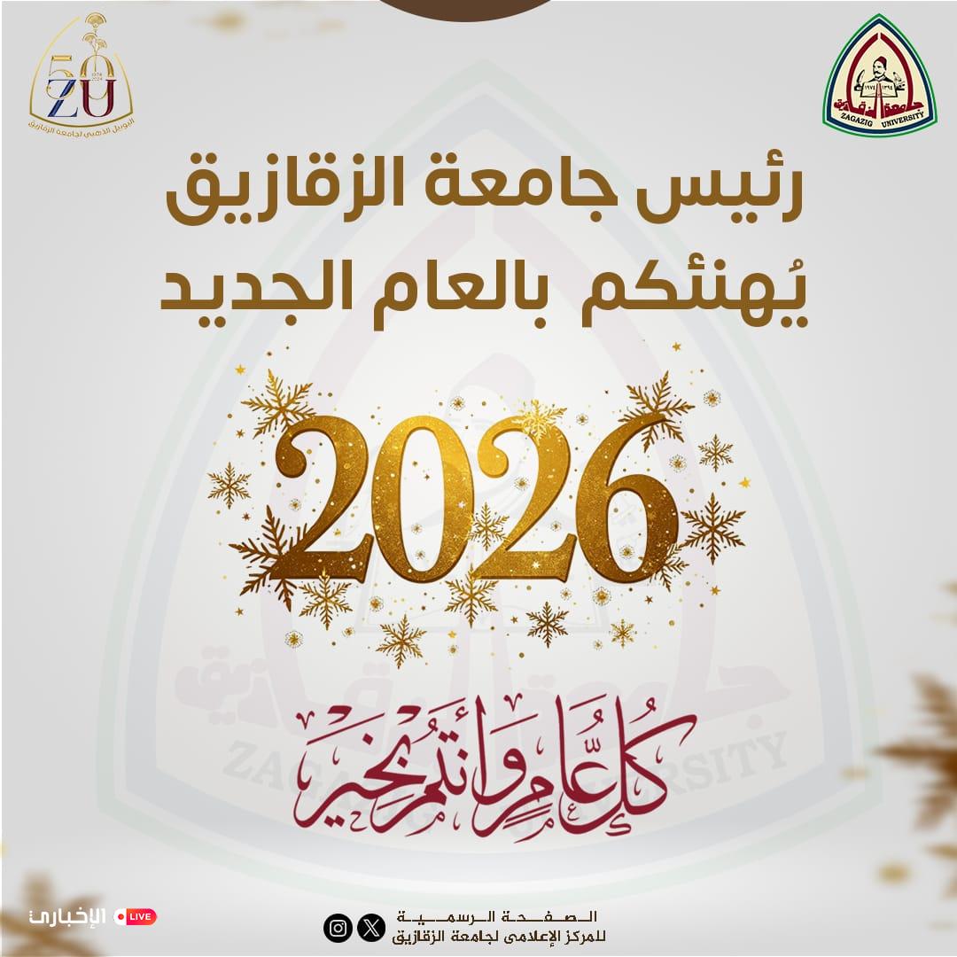 يَتقدَّم الدكتور خالد الدرندلي رئيس جامعة الزقازيق، بالأصالة عن نفسه وبالإنابة عن أسرة الجامعة، بأسمى آيات التهاني إلى فخامة الرئيس عبد الفتاح السيسي رئيس الجمهورية، وإلى الشعب المصري العظيم، بمناسبة حلول العام الميلادي الجديد ٢٠٢٦.