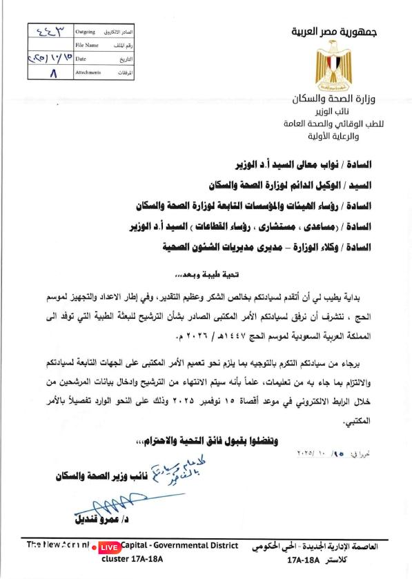 في ضوء خطة وزارة الصحة والسكان، تعلن مديرية الشئون الصحية بالشرقية عن فتح باب الترشح لعضوية البعثة الطبية المصرية لموسم حج عام ١٤٤٧هـ – ٢٠٢٦م، وذلك لجميع العاملين بالمنشآت الصحية التابعة للمديرية، وفقاً للاشتراطات المحددة من قبل الوزارة.