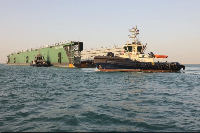 مقطورا عبر القناة 24 ساعة، وتطلب عبوره اتخاذ تدابير ملاحية خاصة نظراً لكونه من الوحدات غير ذاتية الدفع، حيث تمت عملية التأمين الملاحي بواسطة 4 قاطرات تابعة للهيئة.