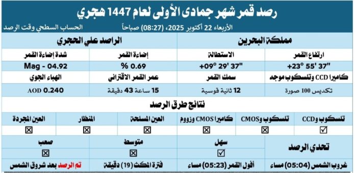 وثق الباحث الفلكي علي الحجري في صباح يوم الأربعاء الموافق 22 أكتوبر 2025، برصد قمر شهر جمادى الأولى لعام 1447 هـ في تمام الساعة (08:27) صباحاً من أفق مدينة عيسى في مملكة البحرين.