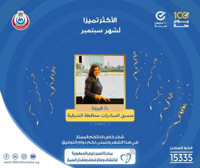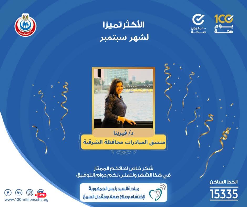 ويأتي ذلك بعد إعلان الصفحة الرسمية لمبادرة ١٠٠ يوم صحة بوزارة الصحة والسكان عن أسماء المنسقين الأكثر تميزاً خلال شهر سبتمبر على مستوى الجمهورية، والتي تضمنت منسقة صحة الشرقية لمبادرة الكشف المبكر عن ضعف وفقدان السمع للأطفال حديثي الولادة، تقديراً لجهودها البارزة في تنفيذ المبادرة والحفاظ على سمع أبنائنا الأطفال.