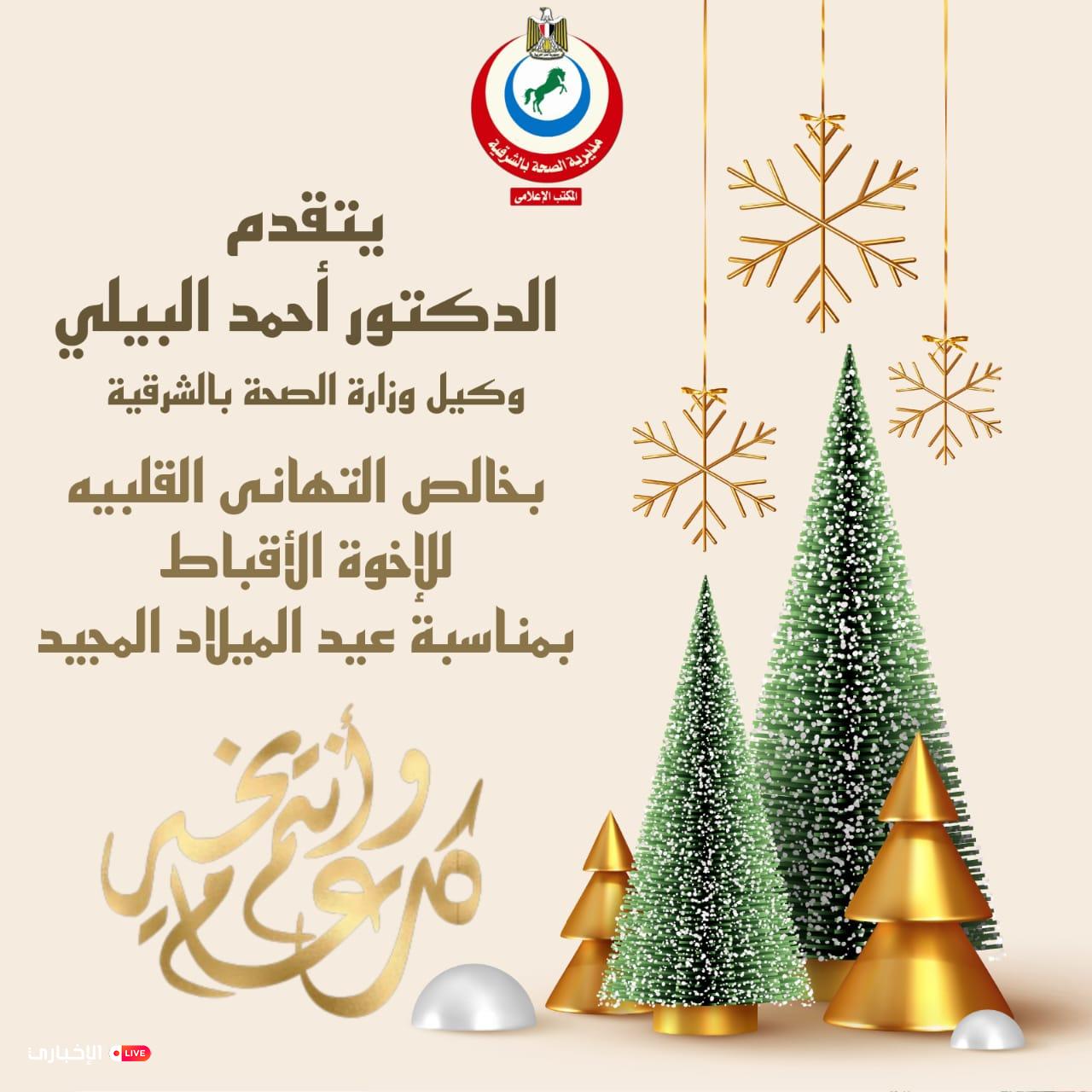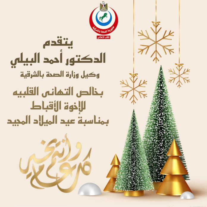 يتقدم الدكتور أحمد البيلي وكيل وزارة الصحة بالشرقية بخالص التهنئة للأخوة الأقباط بمناسبة عيد الميلاد المجيد، داعياً المولى عز وجل أن يعيد هذه المناسبة على مصرنا الغالية بكل الخير والمحبة، وأن يديم عليها نعمة الأمن والسلام والتقدم والازدهار، في ظل القيادة الرشيدة لفخامة الرئيس عبد الفتاح السيسي رئيس الجمهورية.